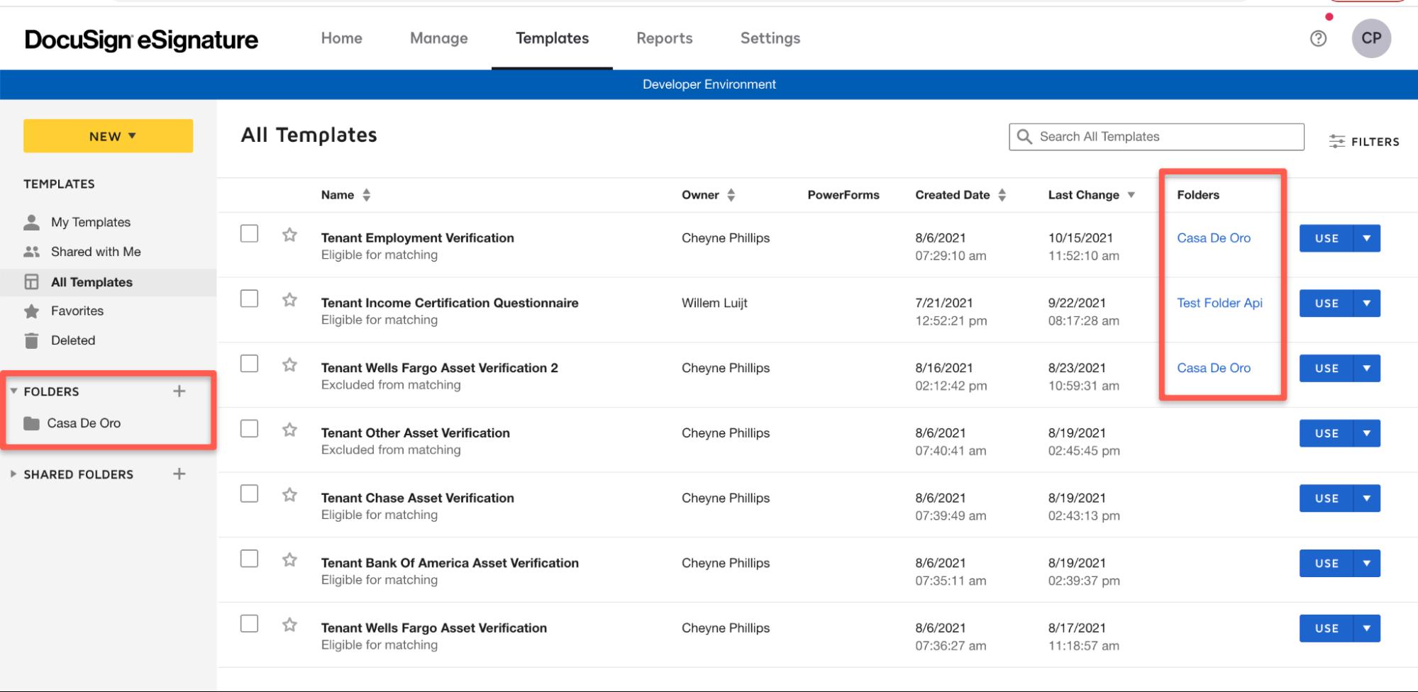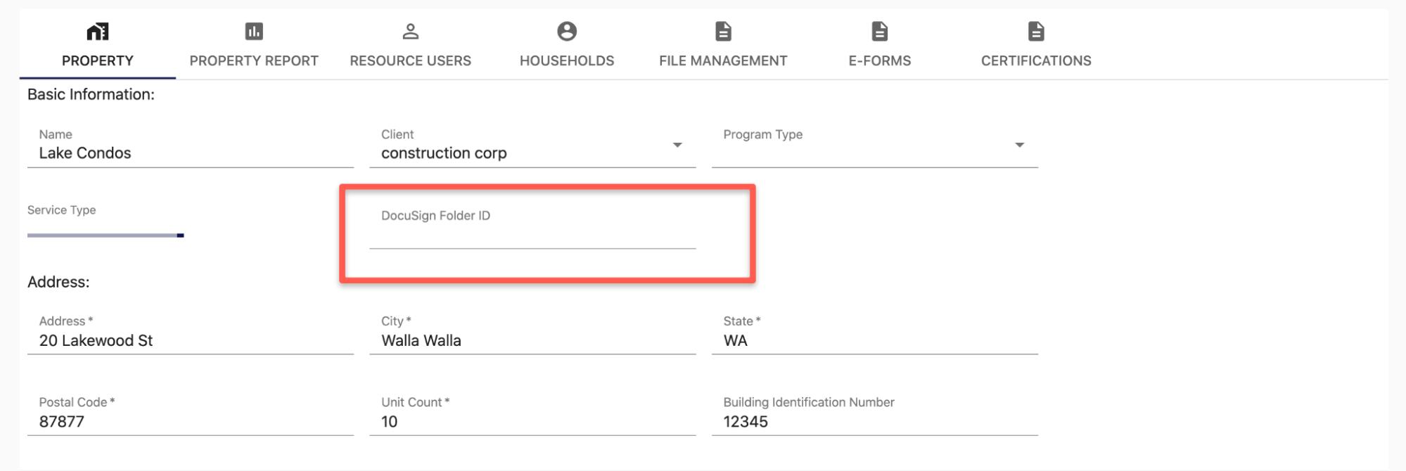 Each property has a unique folder associated with DocuSign.