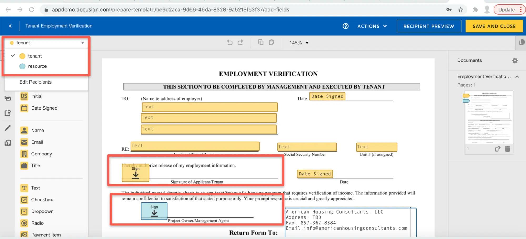 Our client required signatures of both Tenants and Property Management Companies to be signed and stored in DocuSign.