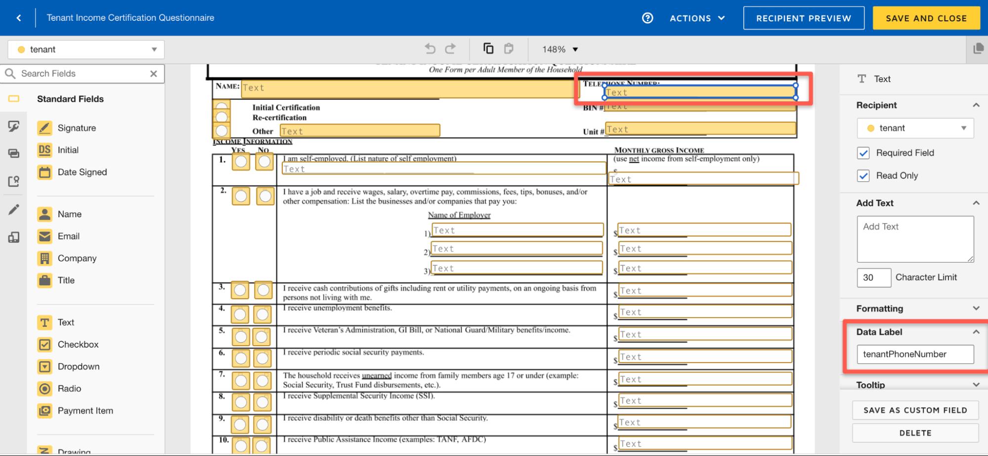 Endertech uses DocuSigns form builder to set up templates with field types.